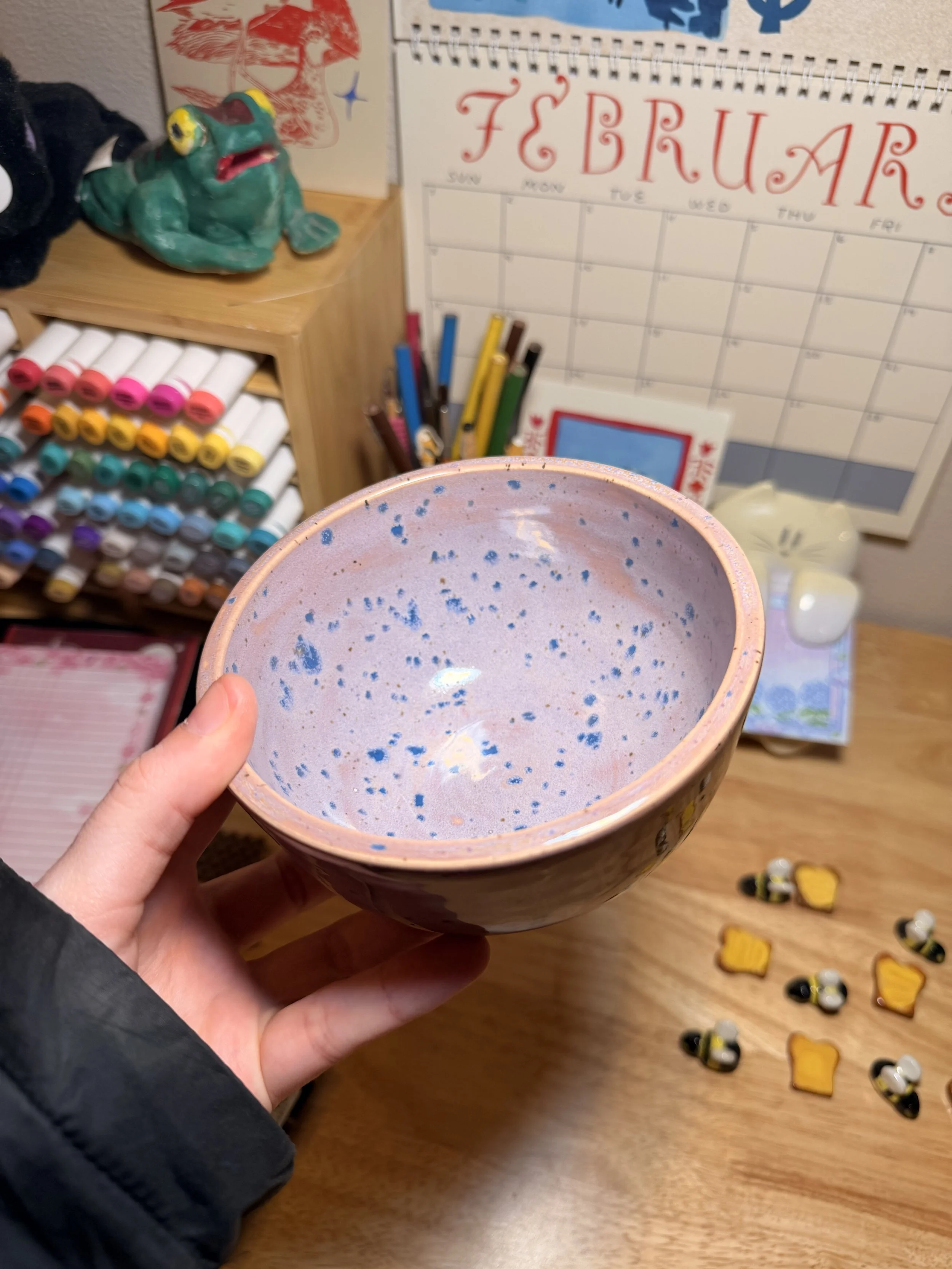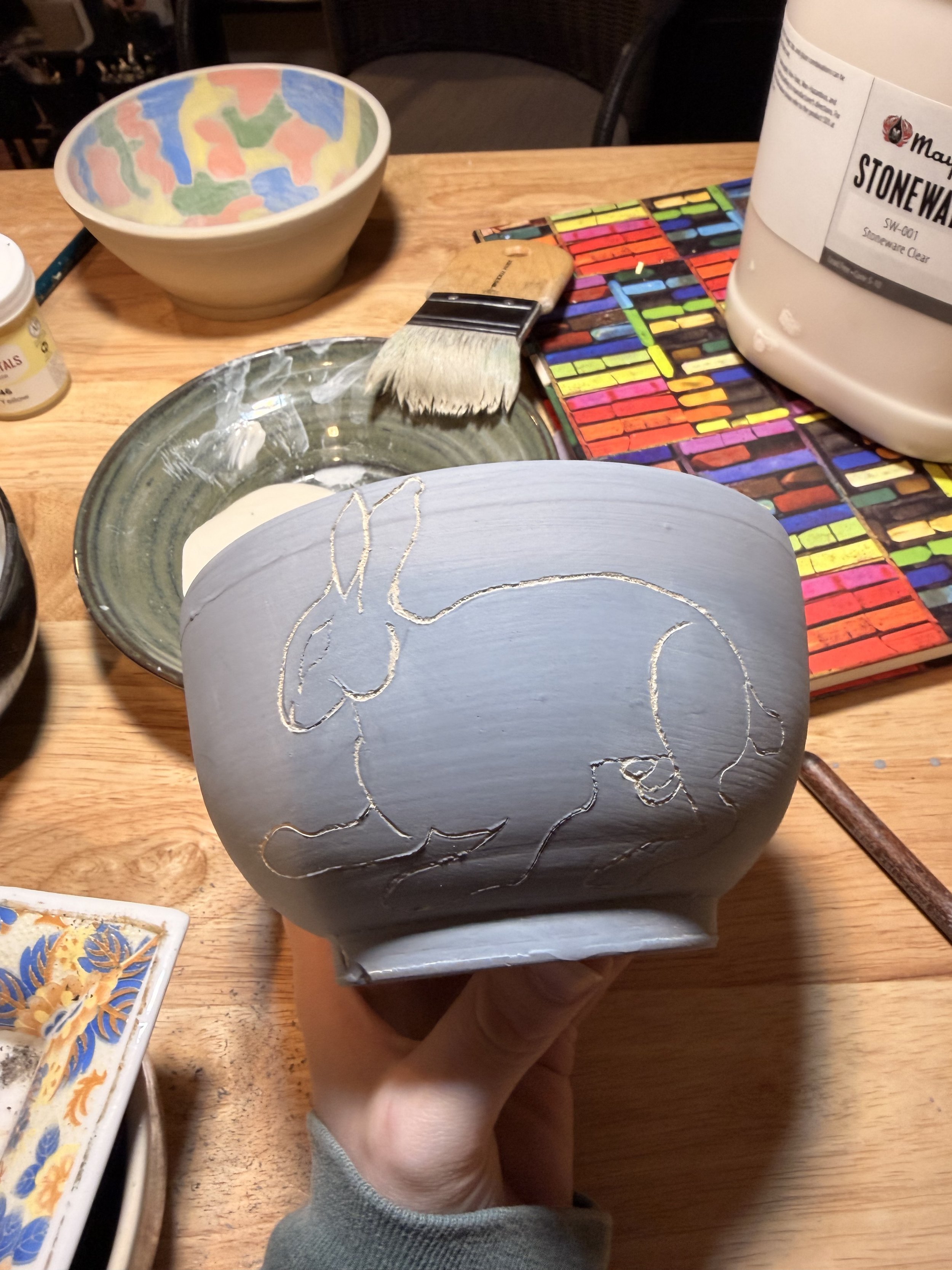 I had a wonderful art date with a friend of mine recently! It happened last month but I still wanted to include in this post because it had such a positive effect on me. I planned for my friend and I to just do surface decoration on some bowls I had thrown the previous day. Surface design is a part of my process where I am beginning to explore and be more creative with, so I went into it with low expectations and no pre-made plan for my design. When the time came to decorate my bowl, I chose one solid color for the background and decided to try my hand at sgraffito (aka carving the design into the surface of the pot). I had no idea what I would carve into it yet, so I picked a random book from my studio for reference and I sketched a cute rabbit that I liked onto paper. Then I transferred that design onto the pot surface and began carving away. I found it a very meditative process and I truly enjoyed chatting with my friend while we both worked on our pieces <3 This was a kind of flow and social connection I didn’t even know I was missing! And that rabbit illustration turned out to be my most favorite thing I’ve made so far this year! I want to say a special thank you to my friend (I know you will read this and ilysm) for taking time to slow down and create something just for fun! It healed something in me :3 It was such a good reminder as to why I wanted to pursue this career! So this is your gentle reminder to make time to be creative with your friends folks!